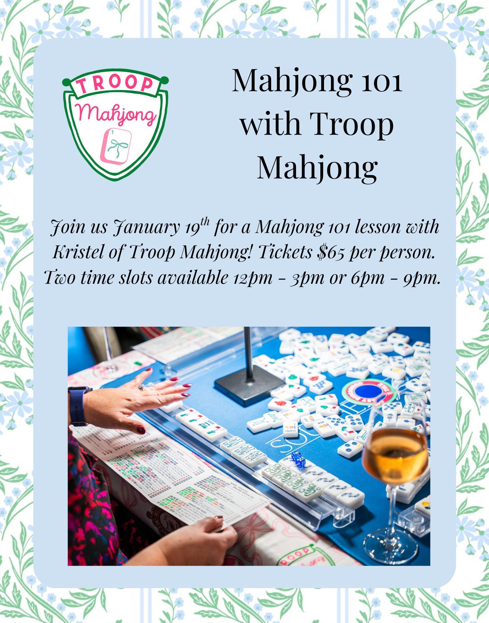 The class includes guided instruction, a Merit Book, Troop Mahjong stickers, and light bites. It all takes place at Indulge Wine Bar, 21 Truss Dr.