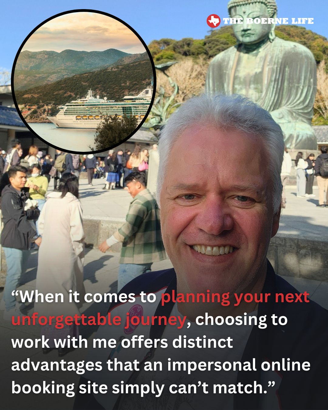 The Boerne Life is excited to welcome Royce Staley of Cruise Planners as a new partner. Based in the Hill Country, Royce helps plan cruises, all-inclusive resorts, guided tours, honeymoons, and custom trips — often with perks and price monitoring you won’t find online, at no extra cost.