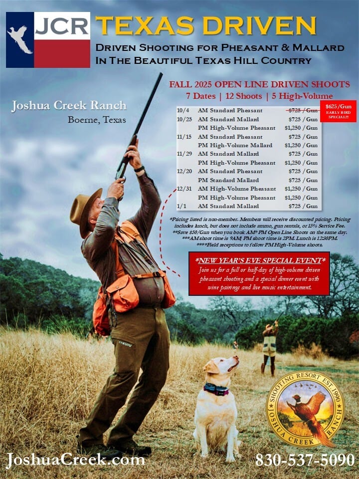 The first open-line shoot of the season happens Saturday at 9 am. Experience a traditional driven pheasant hunt in the Hill Country with a gourmet lunch included. Early-bird special saves $100.