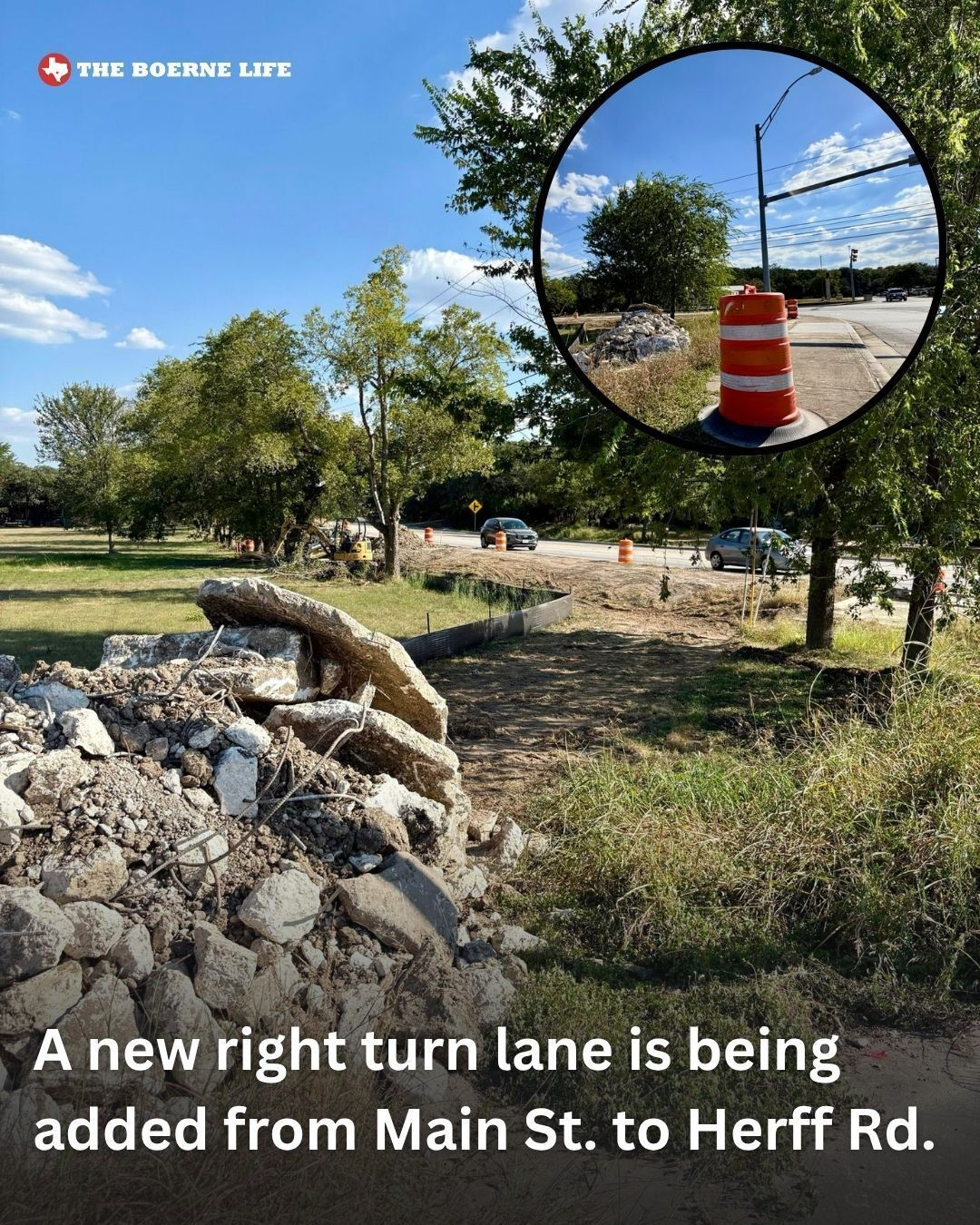 Work has begun on a new turning lane for those looking to turn right off of Main onto Herff Rd. This is for when you're heading north into town on Main Street.