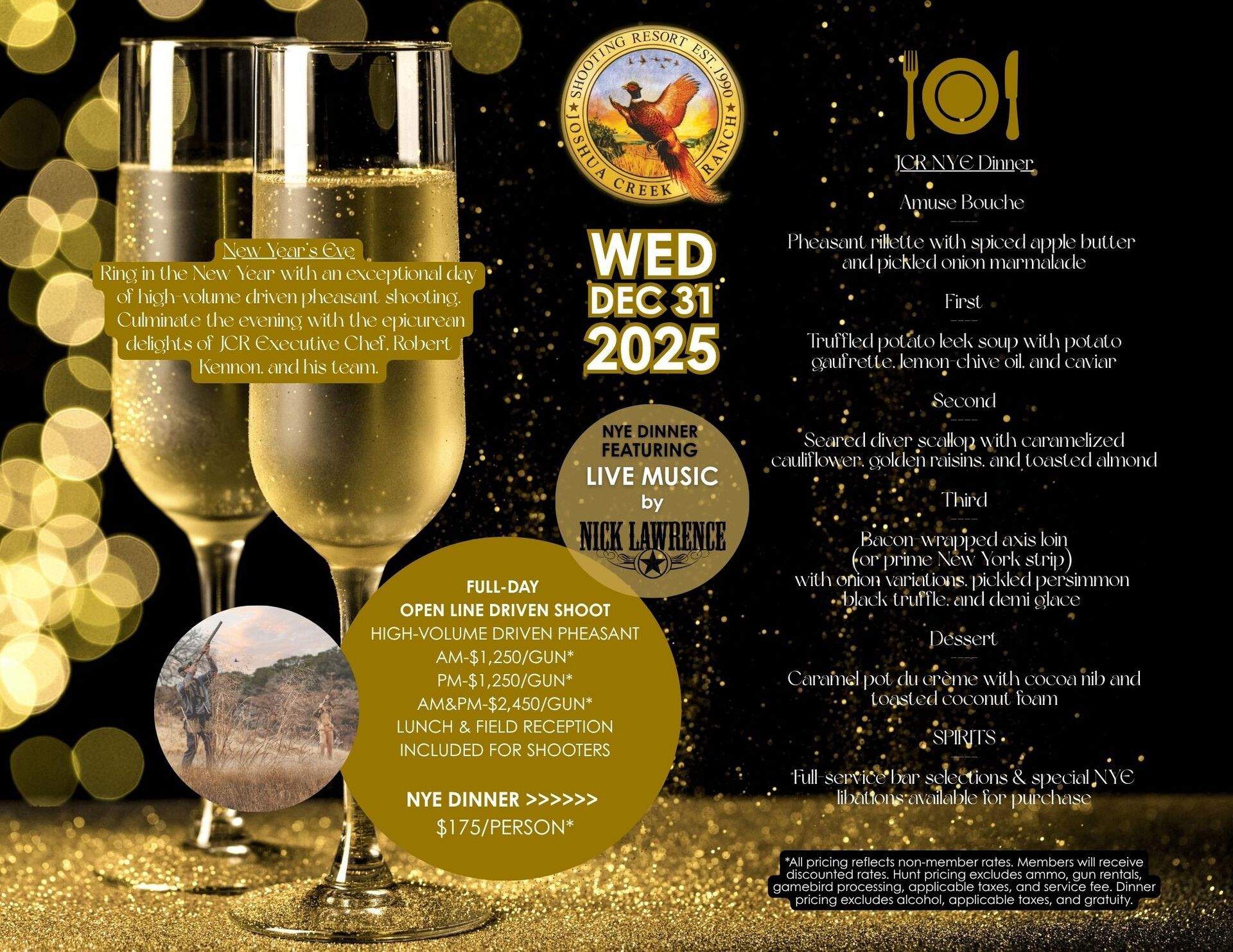 For those wanting the full experience, the ranch is offering a full day of high-volume driven pheasant shooting (AM, PM, or both), followed by an evening of exceptional dining prepared by JCR Executive Chef Robert Kinnon. Live music by Nick Lawrence sets the tone for a festive night, capped off with a multi-course menu featuring dishes like truffled potato leek soup, seared diver scallops, and bacon-wrapped axis loin.