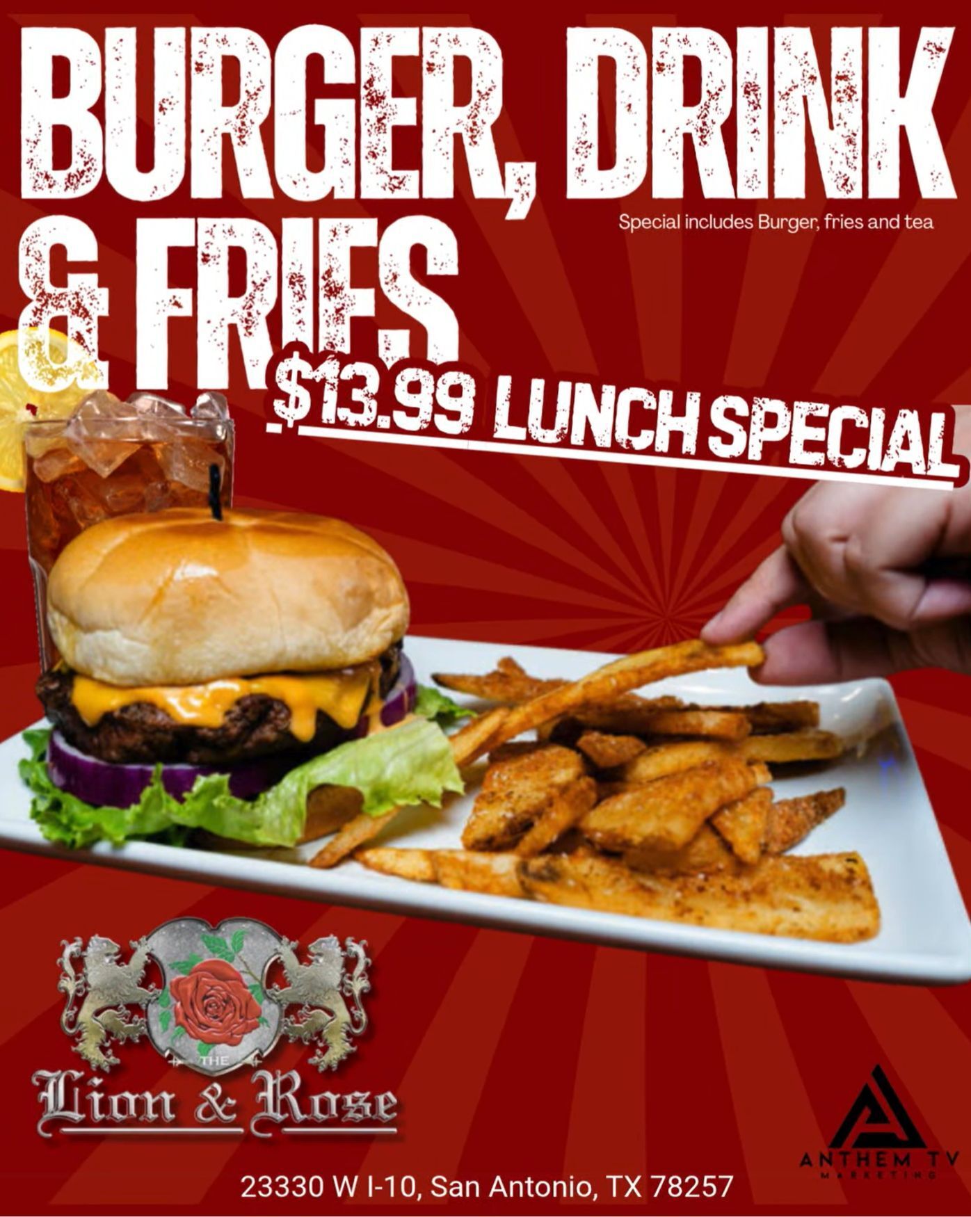 Our partners at The Lion & Rose British Restaurant & Pub are serving up a fast, fresh, and filling Burger Lunch Special every Monday through Friday from 11 am to 3 pm.