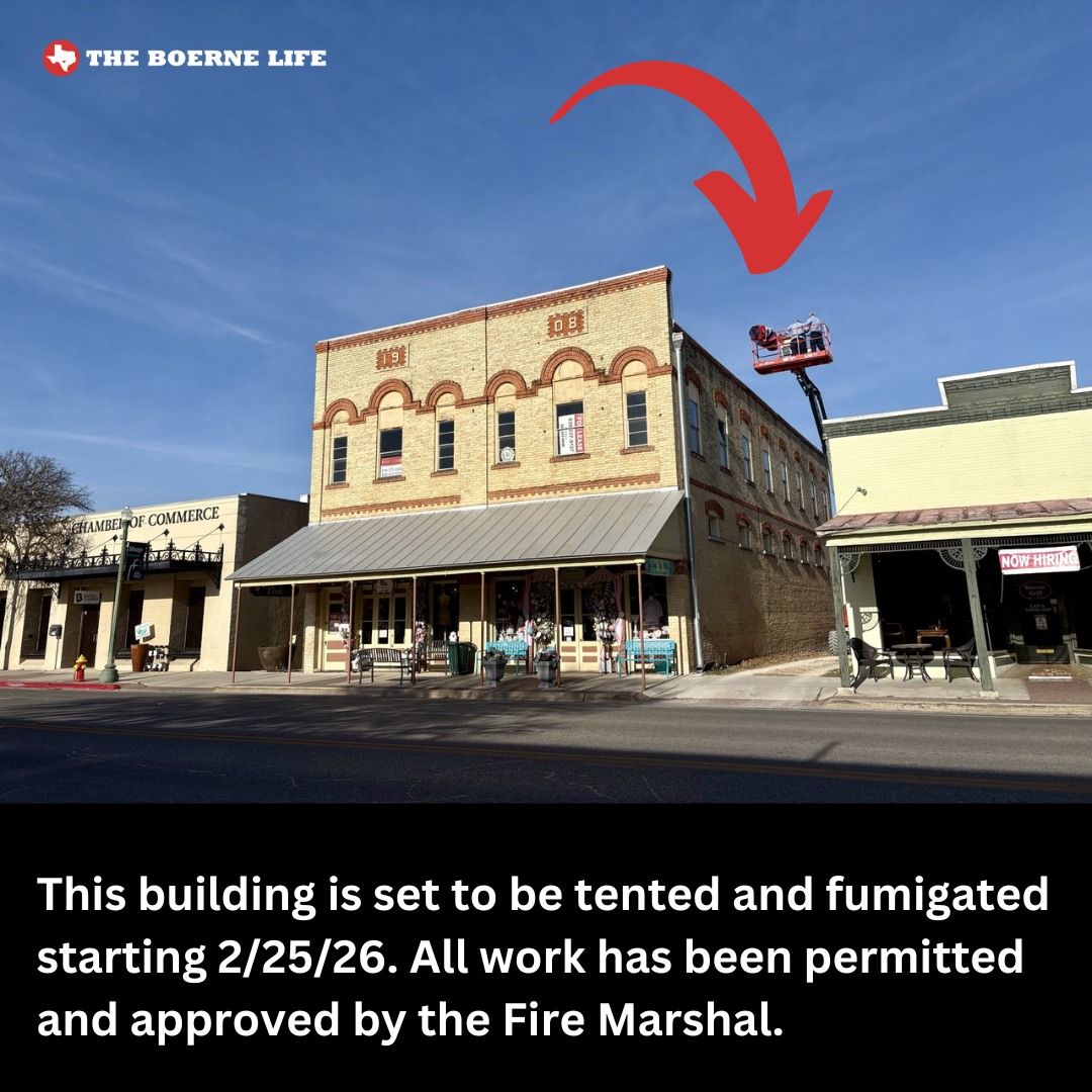 The buildings at 127, 129, and 133 S. Main Street (the current La Te Da and Pixie building, between the Boerne Chamber and Boerne Grill) are being structurally fumigated for drywood termites.