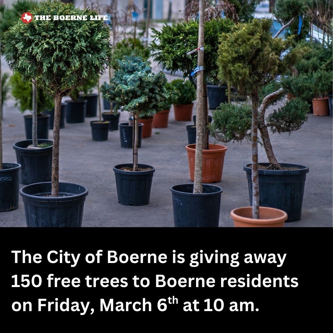 Mark your calendars for Friday, March 6th at 10 am. The City of Boerne is giving away 150 trees to residents who show their City of Boerne utility bill.