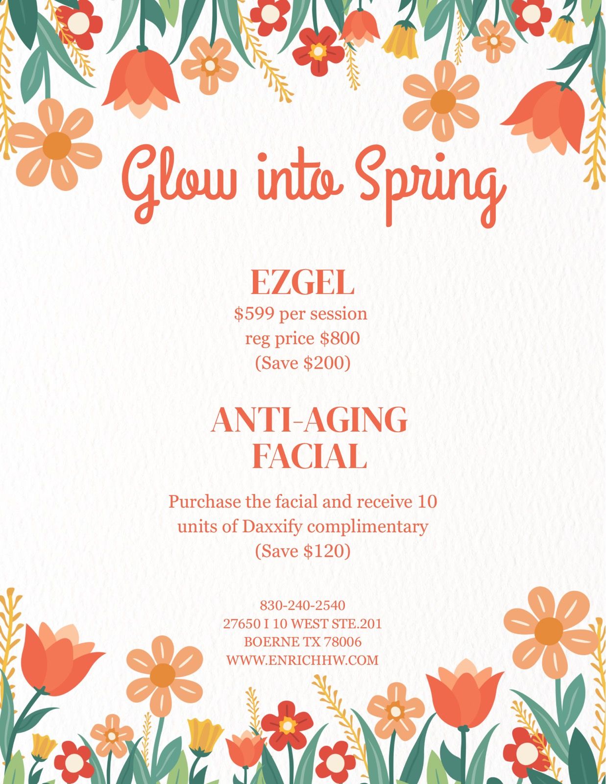 Spring glow-up season is here, and Enrich Health & Wellness is making it easier to finally book that appointment. Their April specials include EZGEL for $599 (save $200) and an anti-aging facial with 10 units of Daxxify complimentary (save $120) â perfect if youâve been thinking about leveling up your routine.